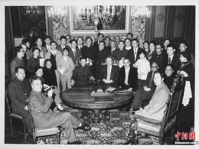 《茶馆》演出团全体演职员在法国奥尔良市政厅和法国政府官员合影。丛林摄