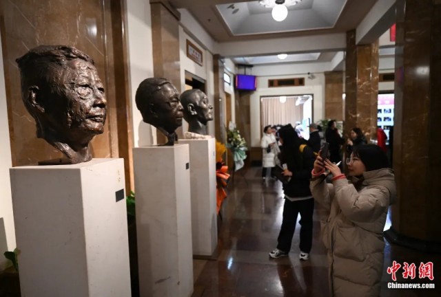 观众在首都剧场拍摄老舍先生塑像。史春阳摄