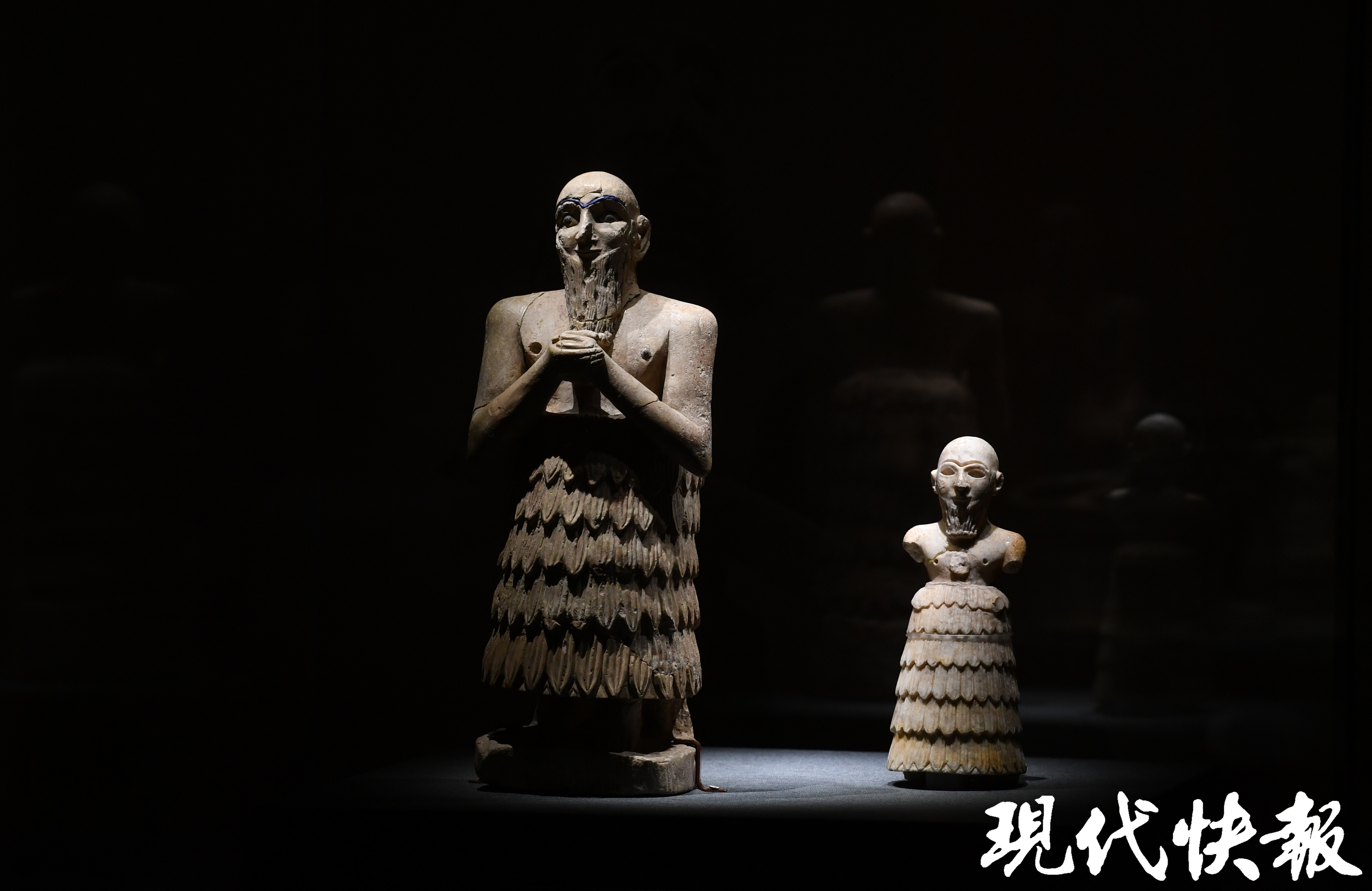 蓄着长须,上身赤裸,下身穿着典型苏美尔人羊毛服饰,双手交叠,虔诚地祈祷着……这是一尊公元前2600~前2400年的祭拜者雕像。他的眉毛、眼睛都是镶嵌上去的。炯炯有神的大眼睛,让几千年后的邂逅者都可以感受到蓬勃的生命力。