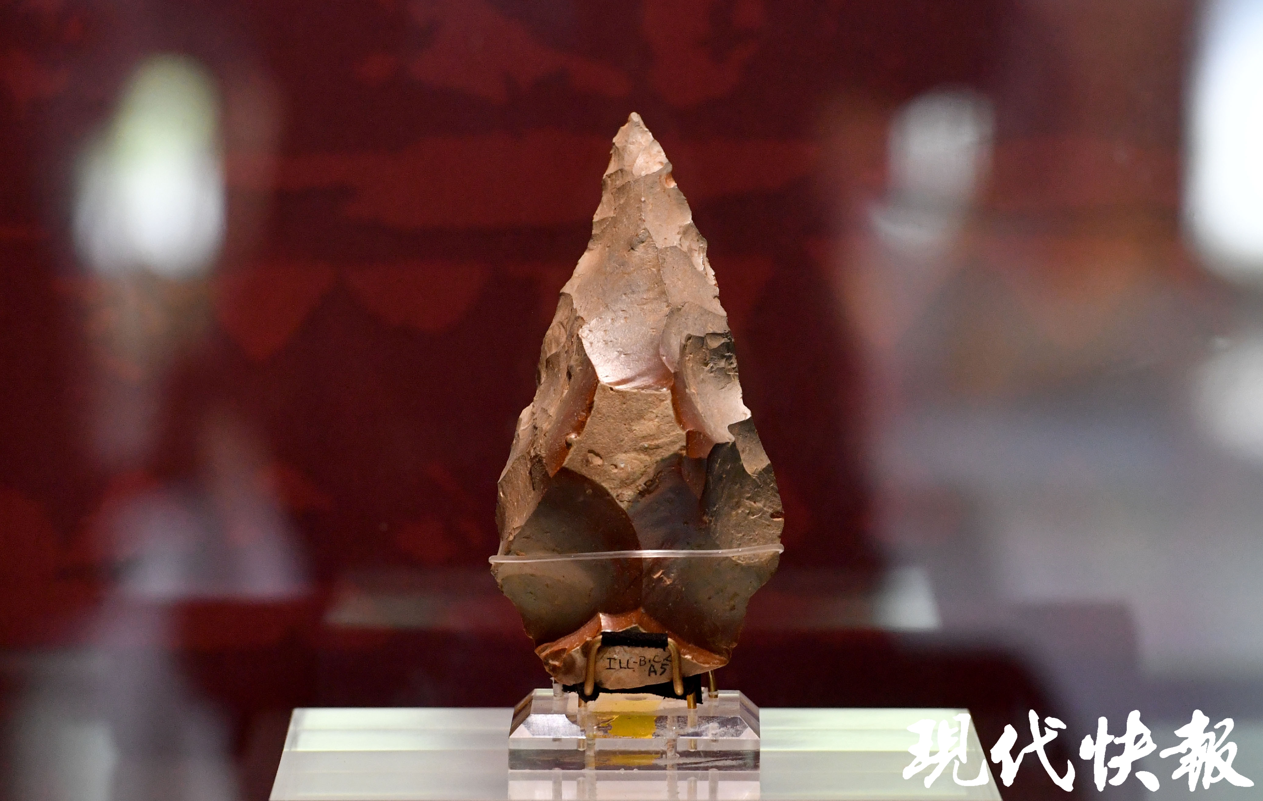 展览中最古老的展品是旧石器时代早期的手斧,距今50万~30万年,属于阿舍利文化,也被称为阿舍利石斧。仔细看,它由两面打制而成,左右两边和正反两面基本对称,一端较尖较薄,另一端略宽略厚,呈泪滴形。阿舍利手斧被公认为人类历史上第一种标准化加工的重型工具,代表了古人类进化过程中石器加工制作的最高技术水平。