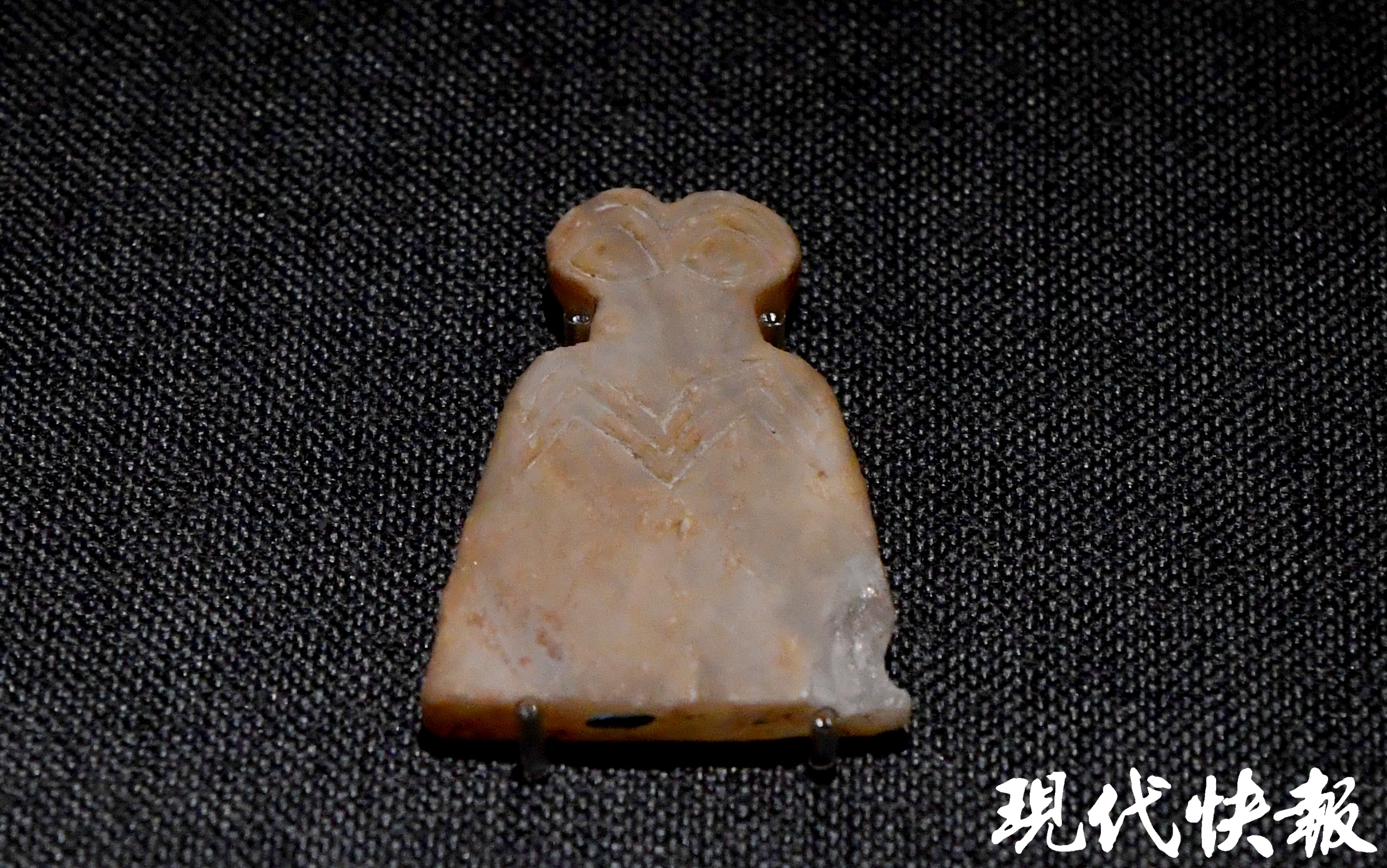 据介绍,这件器物发现于叙利亚布拉克丘的“眼庙”遗址,距今已有约4900年的历史。在这里曾出土了数千件雪花石膏制成的人偶雕件。这些雕件形状不同,大小各异,但在雕刻中都强调对人物眼睛的刻画。造型有单眼、双眼、四眼等各种样式。