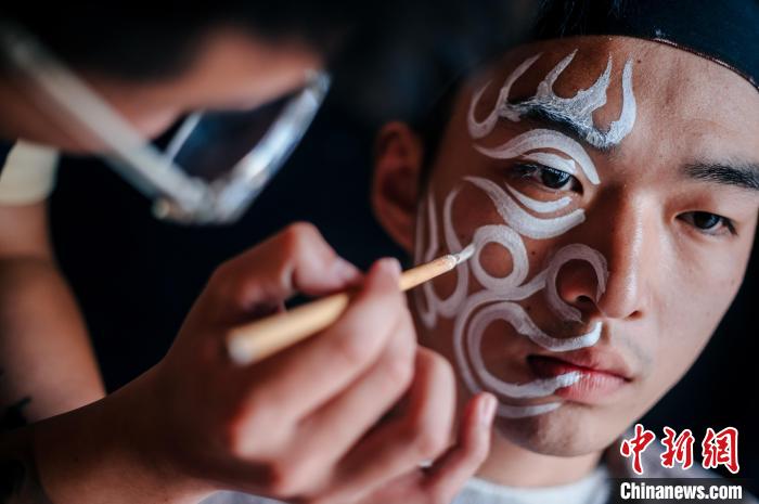 中新网福州5月21日电(记者林玲)凌晨三点,位于福州市仓山区叶夏村的锦麟轩八将团灯火通明。团长、面师……在团中身兼数职的黄杜飞正在为团员们描绘脸谱,这一过程被称为“开面”。