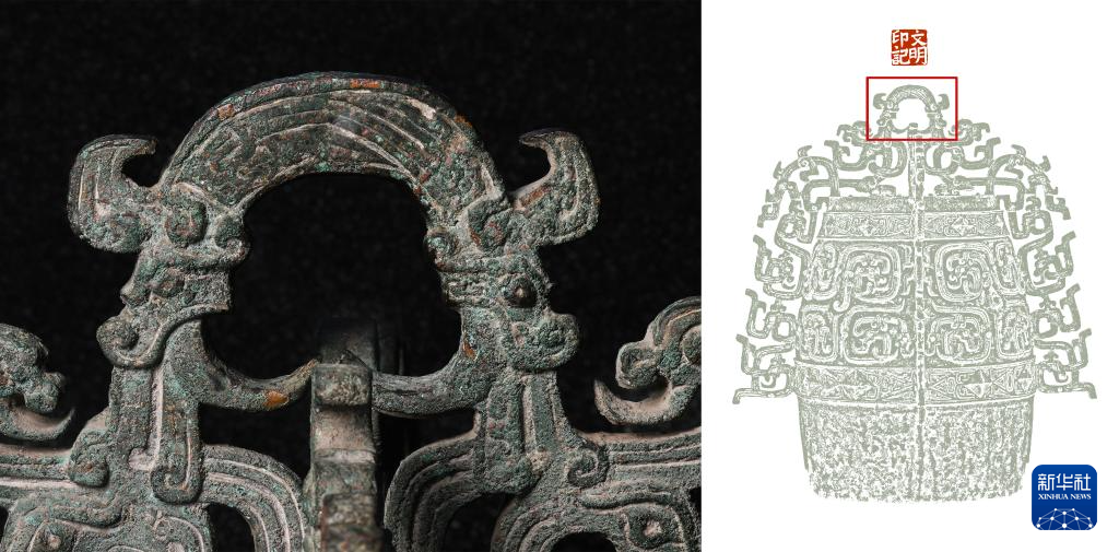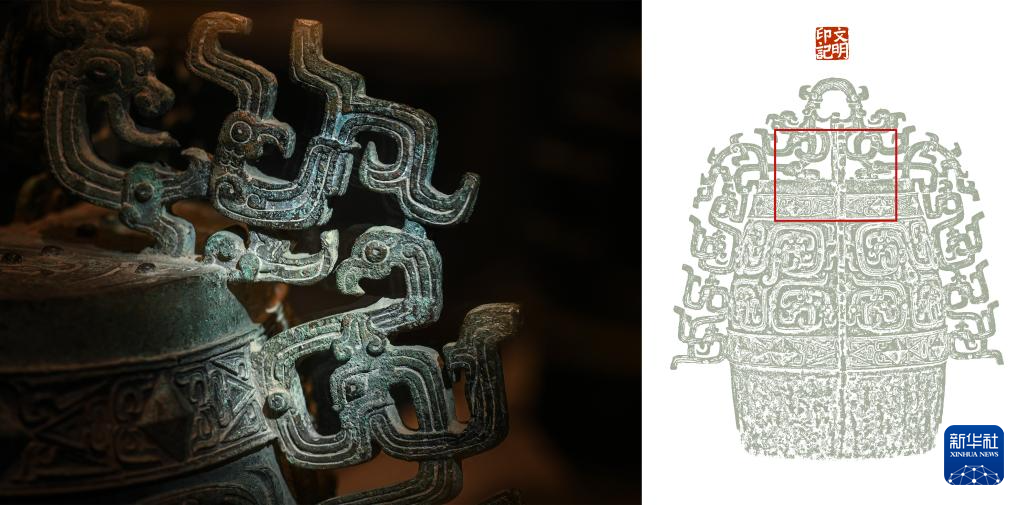 拼版照片,左图:秦公镈(一号镈)“钮”部特写(2024年1月23日摄);右图:左图画面在镈身位置示意图(红框内)。 新华社记者李贺制图pagebreak
