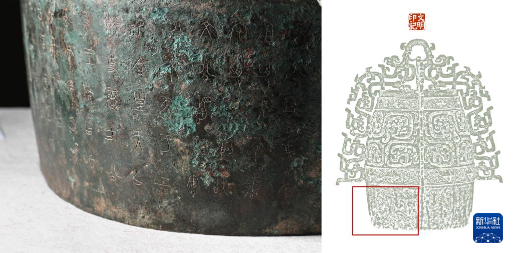 拼版照片,左图:秦公镈(一号镈)“鼓”部刻铭局部(2024年1月23日摄);右图:左图画面在镈身位置示意图(红框内)。 新华社记者李贺制图pagebreak