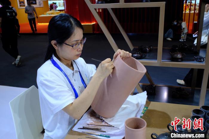 她介绍,由于采用广西钦州特有的紫红陶土,坭兴陶古色古香,可雕刻出人物花鸟等精细的线条,受到收藏界喜爱。“如今我们在纹饰雕刻时,也会融入一些现代造型元素,受到年轻群体欢迎。”陈荣荣说。