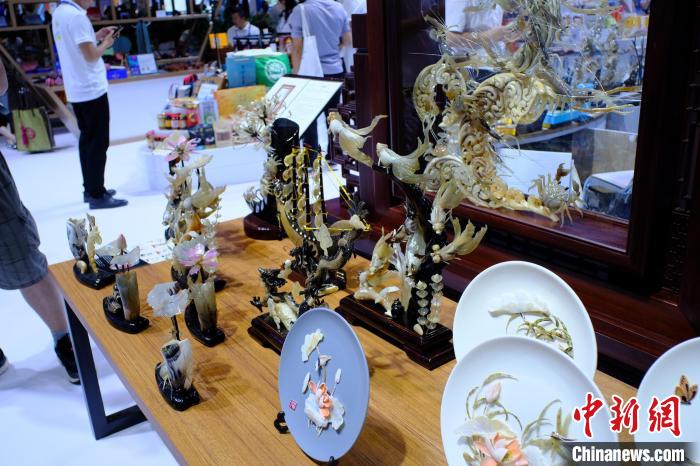 “前几年,我们的合浦角雕作品还经由浙江义乌,销往世界。”广西合浦角雕的传承人白霆麒颇为自豪。他展台上的角雕作品整体温润如玉,金鱼、虾和龙等造型逼真,身上的鳞片凹凸有致。这些作品均由牛角或羊角雕刻而成。