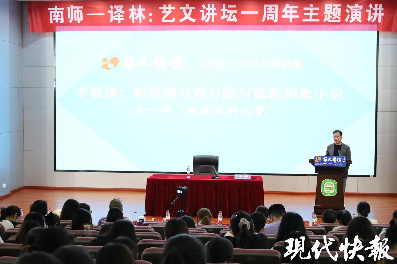 带火菏泽南站的短视频红人郭有才,如何让我们重新想象小说?5月24日,在译林艺文讲坛创设一周年之际,中国作家协会副主席、著名文学评论家李敬泽来到南京师范大学,围绕“短视频与戏与曲与重新想象小说——另一种‘欢迎来到天堂’”展开精彩演讲。江苏省作家协会主席毕飞宇、南京师范大学党委副书记贲国栋、译林出版社副总编辑陆志宙、南京师范大学文学院教授何平等嘉宾出席此次活动。