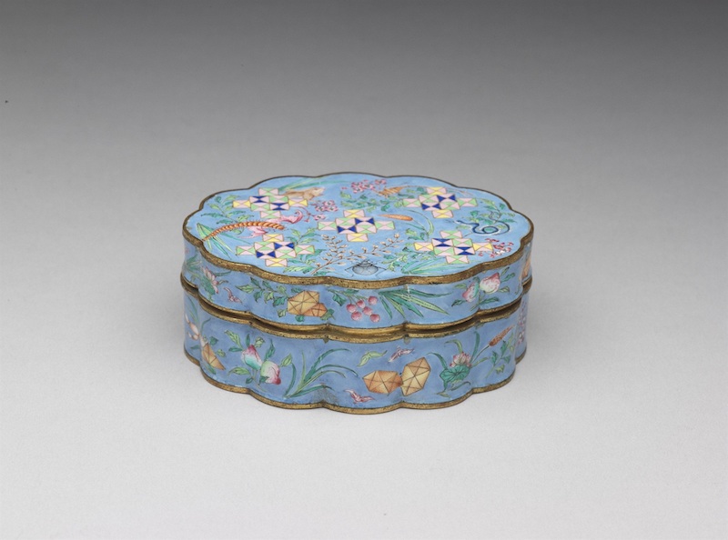 全器画珐琅为饰,粉蓝色底,盖面绘五个由粉、黄、蓝、绿构成的几何棱格纹,及蝎、蛇、蜈蚣、蟾蜍、蜘蛛五毒,间饰各式花草。盖沿及盒身绘有黄褐色几何棱纹,饰桃实、荷花等花草果实。