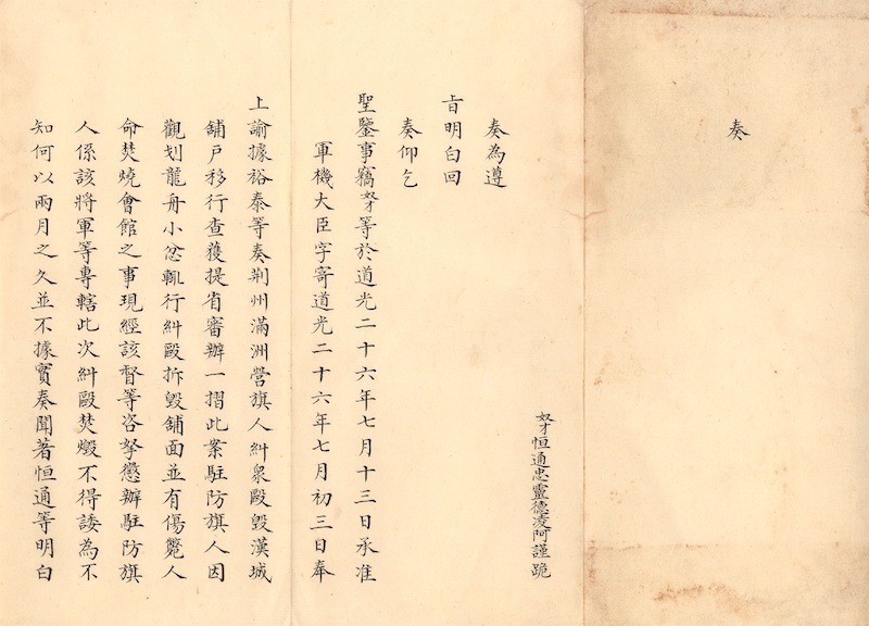 奏报荆州营旗人纠众殴毁汉城铺户之情事道光二十六年七月十四日(1846-09-04)恒通等