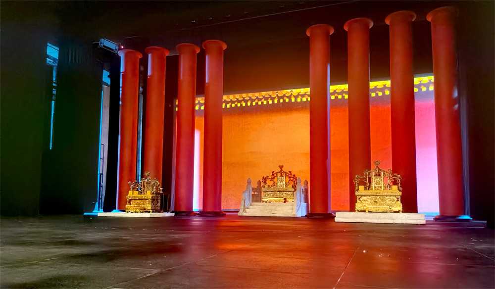 话剧《张居正》演出谢幕后的舞台空镜,八根立柱赫赫在目。摄影王诤