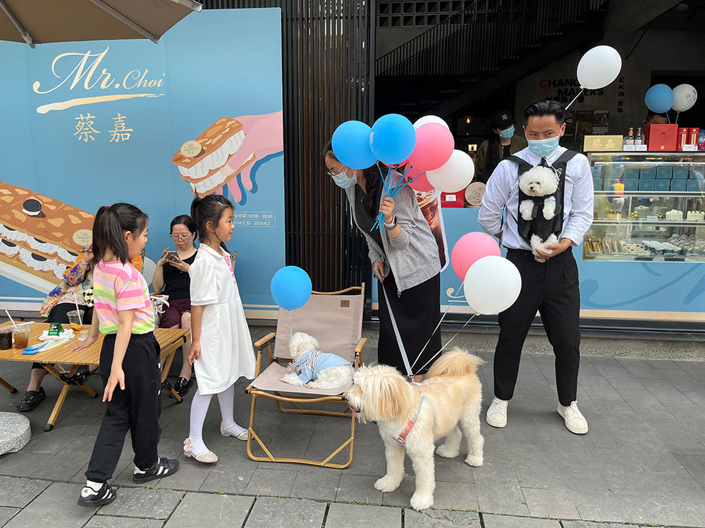 宠物友好商店门口,系上七彩气球的宠物们