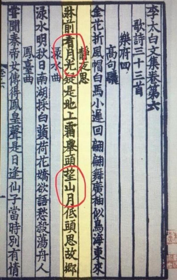 宋蜀刻本《李太白文集·静夜思》书影
