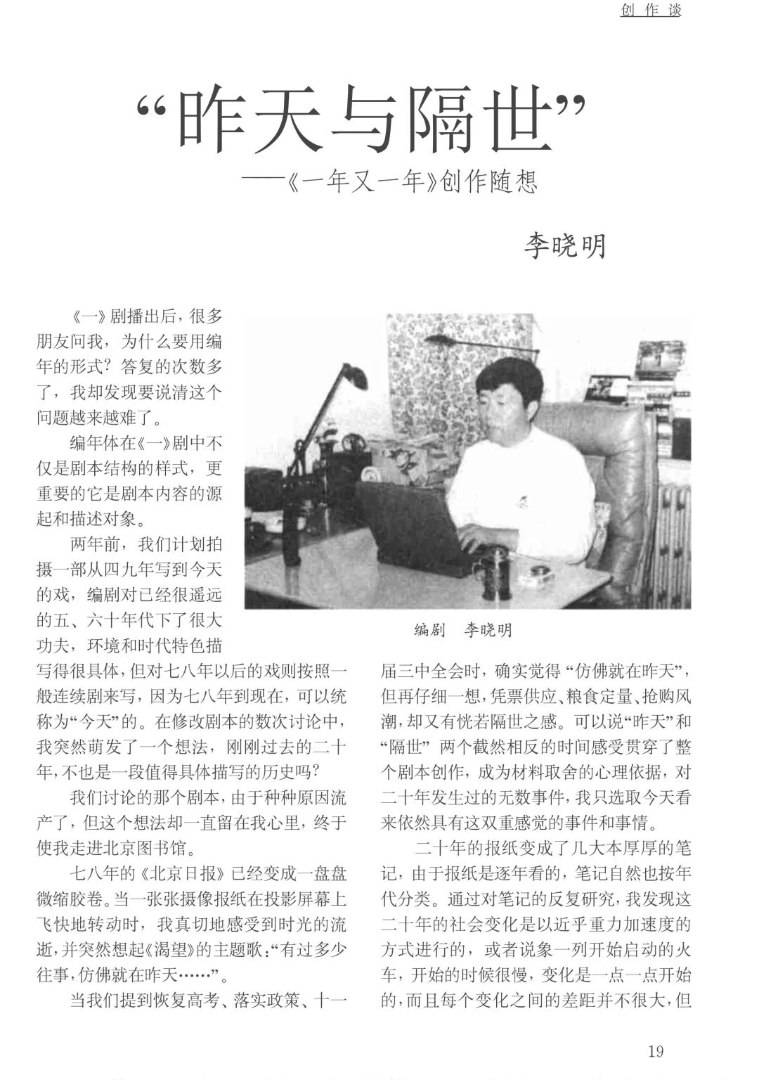 作为曾经创作过中国第一部室内剧《渴望》以及《北京人在纽约》《过把瘾》等热播电视剧的著名编剧,李晓明面对再创作一个“第一部”又有哪些巧妙构思?为什么该剧的真正主角是“一年又一年”?请重温《中国电视》1999年第12期刊发的编剧李晓明创作随想。