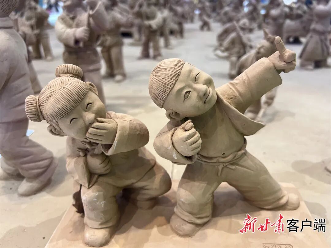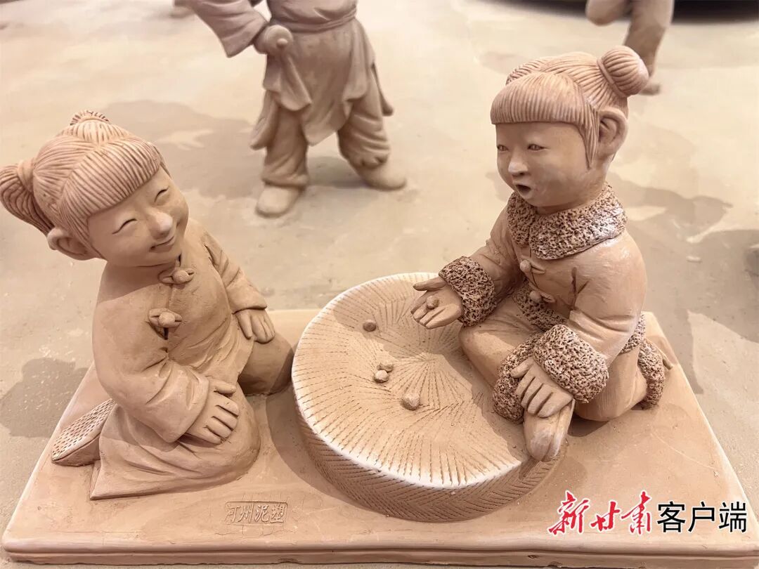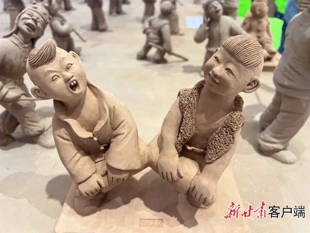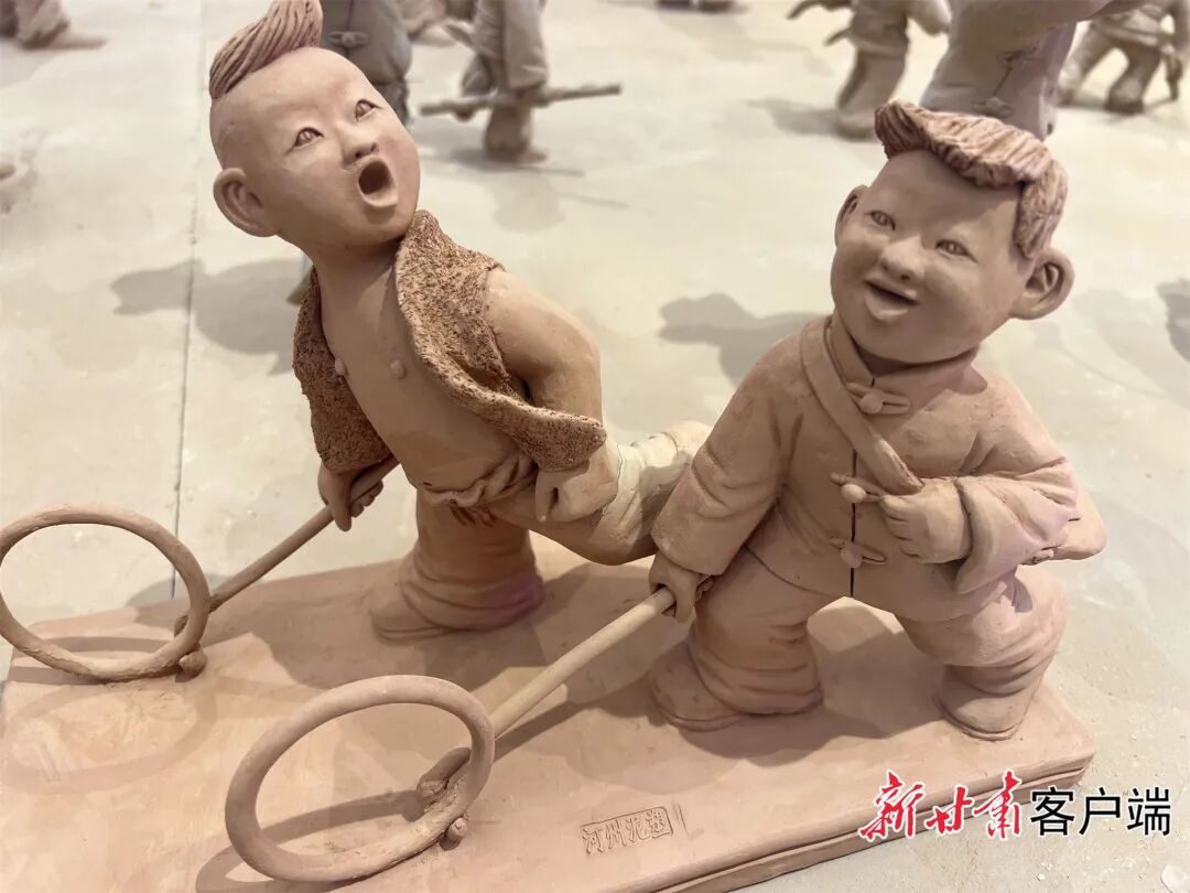 除了《如意甘肃 西北秧歌》组件,常天平还带来了近期新作——童趣系列小品类泥塑作品。丢石子、滚铁环、斗鸡、木轱辘车、打弹弓……一件一件看过去,个个惟妙惟肖、生动如真,令人欲罢不能。