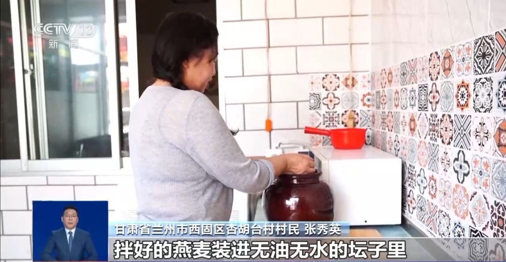 甘肃省兰州市西固区杏胡台村村民张秀英:拌好的燕麦装进无油无水的坛子里,它就不会变质。