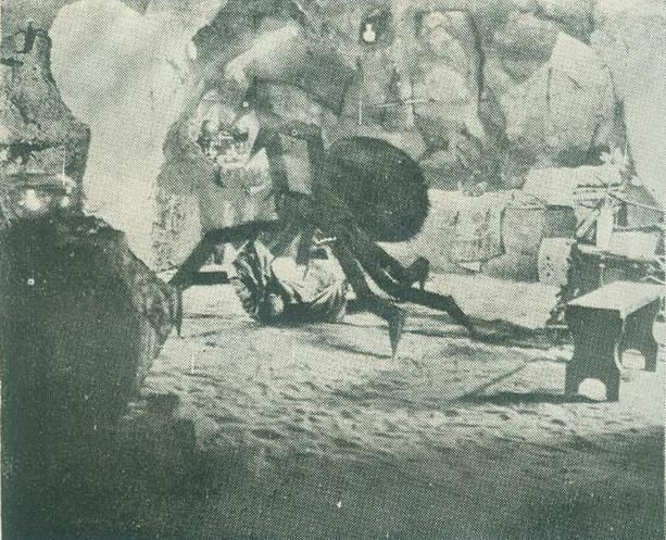 《盘丝洞》也尽可能地用当时所能做到的各种电影视觉特技去还原原著中光怪陆离的神话情节,比如孙悟空的七十二般变化,包括用一撮猴毛变出一群孙行者,都需要熟练掌握运用特定的拍摄和后期暗房技术。片中蜈蚣精正在开怀畅饮,突然发现酒中藏着微缩的孙悟空。这是运用了摄影机近大远小的透视原理,在后期洗印胶片时,将远景拍摄的孙悟空与特写拍摄的酒杯进行叠印的效果。在早期电影特技中,法国魔术师兼电影导演乔治·梅里爱的贡献颇多,他创造了慢动作、快动作、倒放、多次曝光、叠化、停机再拍等众多胶片特技,多数都能在《盘丝洞》中找到痕迹。这就表明,在上世纪20年代,中国电影在技术、特技和工艺上,几乎可以说是与全球电影同步的。