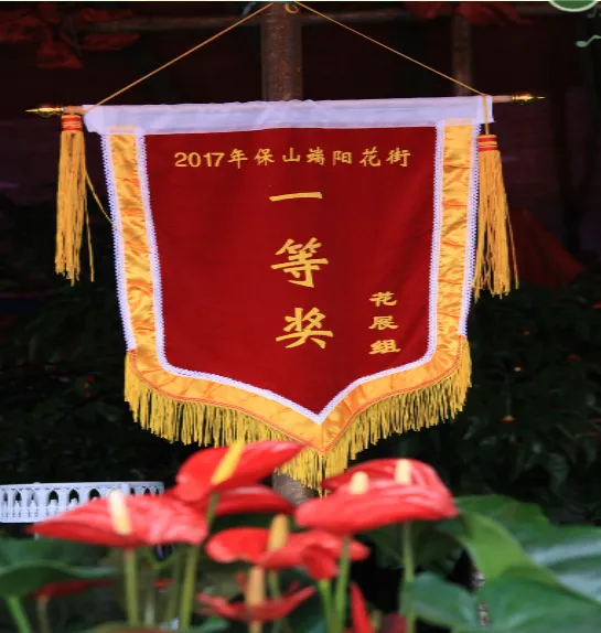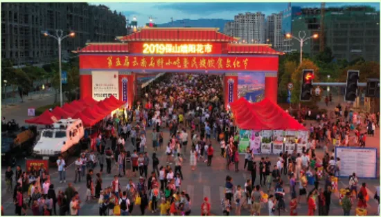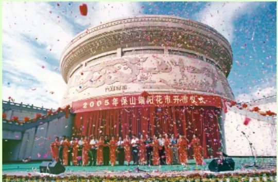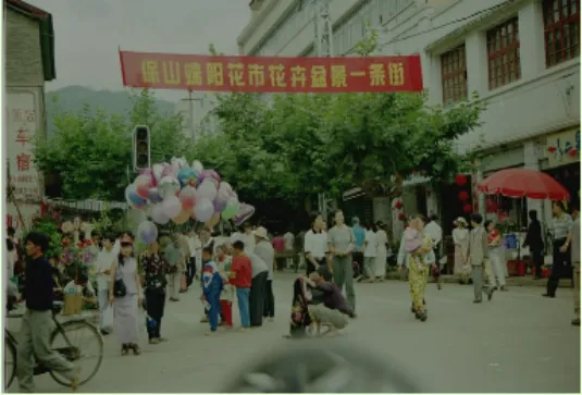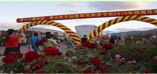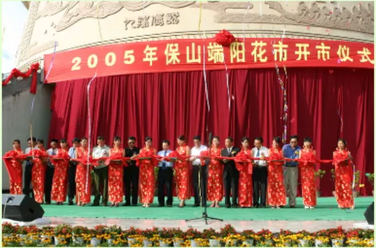 保山素有“鲜花之城”的美誉。但有史以来保山城的鲜花都不是规模种植,而是被随意地种植在房前屋后、甚至墙头檐脚。但不论种植在什么地方,鲜花都竞相绽放,把个个院落装扮得生机勃勃,极为美丽。用藤等草药熬制“香汤”浴身。这些习俗,无不表达着传统的保山人珍惜生命,热爱生活,向往美好的心愿。农历五月初五是鲜花的节日。这一天,保山城里几乎所有的鲜花,大山深处藏有的仙草奇药都汇集到花街上来了。于是,花街成了花的海洋,花的河流。对于保山人,这一天无疑是最舒心最爽朗也是最清闲的日子。城里人,特别是妇女,她们穿上干净的衣裳,早早地起床,洒扫庭院,给孩子胸前挂上鸡心、香包,用雄黄涂染脸蛋,在招呼丈夫、孩子吃过粽子、包子、煮鸡蛋、煮大蒜之后,便挎上提篮赶花街去了;保山坝子的农民,田里的秧苗插完了,地里的玉米铲过了,可以歇口气了夏天到了,臭虫蚊子、各种疾病要来了,需要买点药草回来防治了。于是这一天,他们不再下地,早早地起床,吃过媳妇包的粽子、蒸的包子、煮的大蒜、调制的雄黄酒之后,便带着媳妇娃娃,前呼后拥地从四面八方向城里涌来,在鲜花、药草之间徜徉,直到太阳偏西了,才提着大捆的药草,端着鲜花满足地回家。这一天,保山人一般都要植树。因为保山素有保山人的养花习性的形成,除了气候、雨量等自然条件使然外,可能还与明代大量江南移民的涌入带来先进的园艺技术有关。一座以花为节日的城市,五月端午,插棵杵棒也会活”的说法。“民国时期,端阳花街为期一天,以关庙街为花市,老县街为药市。”关庙街为今保岫西路与小北门街相交至与正阳路相交之间的那一段,老县街为今正阳路与保岫路相交至与朝阳街相交之间的那一段。那时的关庙街像条鱼的脊梁,中间高,两边低,街面上铺着三条青石板,中间的一条稍宽,约六七十厘米,两边的稍窄,约四十厘米,石板之间镶着鹅卵石,每年端阳节,保山人都要把自家种的鲜花挑到街上去展销,附近的山民,也采了时鲜药草来出售。人们谓之赶花街。与花街相伴的,还有许多习俗。街道两边有小水沟,沟的底面、两侧均镶着青石板,沟里的流水常年不断,清澈见底。街道两边是清一色两层或一层青瓦、木板壁、楼下是有柜台的铺子的民房。花木就摆放在这些房屋前面的人行道上,家住关庙街的人家,花木就摆放在自家铺了前面,家不住关庙街的人家,花街前几天就到关庙街来选摊位,选着了,便跟主人家商量,说明想在他家门口摆设花摊的意思。如果主人家事先没有答应其他人,一般都会答应。到20世纪70年代初期,赶花街依然在关庙街,但这时的关庙街是条宽阔的柏油马路。有青石板、卵石、流水的关庙街在上个世纪五十年代末期就被拆除了,继之以弹石路,柏油路是在上个世纪七十年代初期铺设的。这时的花街依然是民间的自发的。但女子以“香汤”浴身,以艾蒿熏室,新松毛铺地等习俗在早些时候就消失了。20世纪70年代末,花街从关庙街移到了上巷街。这时的花街已不在是纯民间的,而由政府倡导、统一组织管理。街期由过去的一天改为三天,除民间依然自发的上街摆设花摊、展销花卉之外,各机关、企事业单位也上街搭建花棚,展销花卉, 展销产品。保山花街不仅是花的世界,还是各类药草的世界。清晨,那些带着山野气息的“山里人”,把他们采挖的各类时鲜药草一篓篓背到花街上来,摆在药街的两边出售。于是,保山城的充满花香的天空,又多了阵阵药草的清香。一座以花为节日的城市。2000年设计的《世纪同心》种了这棵同心树,20多年过来了,不知道还有几对在坚守。