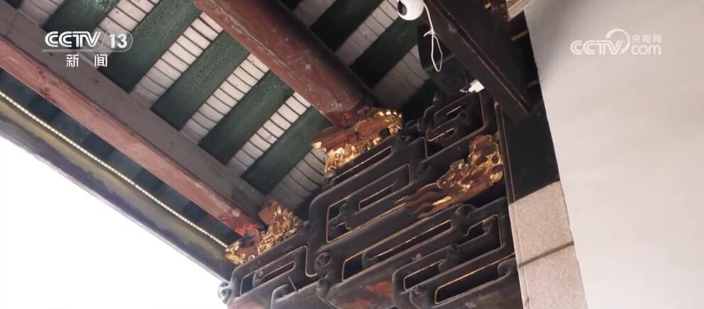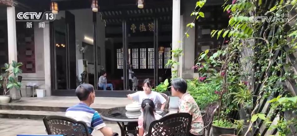 青砖铺地、绿瓦檐前,在街巷中穿行,青苔漫布的墙上,留下了不同年代的痕迹。从早已斑驳的贝灰墙面到上世纪八九十年代的水刷石墙面,每一栋民居都保留有自己的特点。这里是一座建于20世纪40年代的民居,这几年,房子的主人把前院开辟出来,改造成了可供游客歇脚的茶舍。这里的一砖一瓦,大部分都是老宅子保留下来的,比如,顶上的斗拱就是非物质文化遗产金漆木雕,既承载了潮州人的历史记忆,也成为对外展示古城文化的窗口。