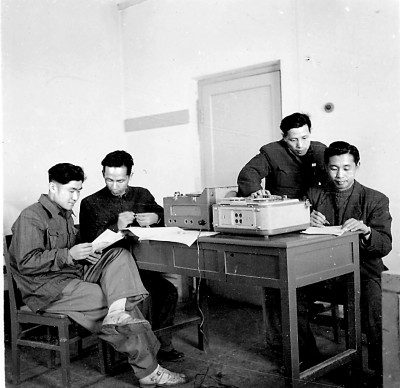 1959年5月,中国艺术研究院音乐研究所简其华(左二)在新疆乌鲁木齐校对采访录音。图片由作者提供