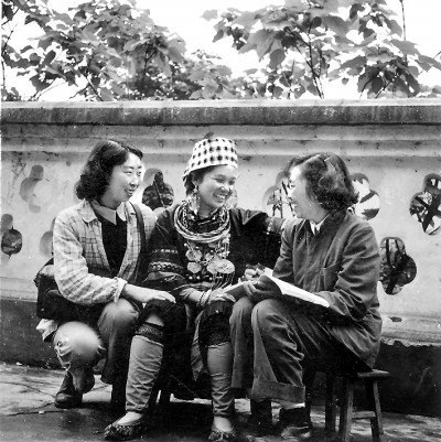 1957年,中国艺术研究院音乐研究所何芸(右)和张淑珍(左)向贵州榕江水族妇女莫正英采集山歌。图片由作者提供