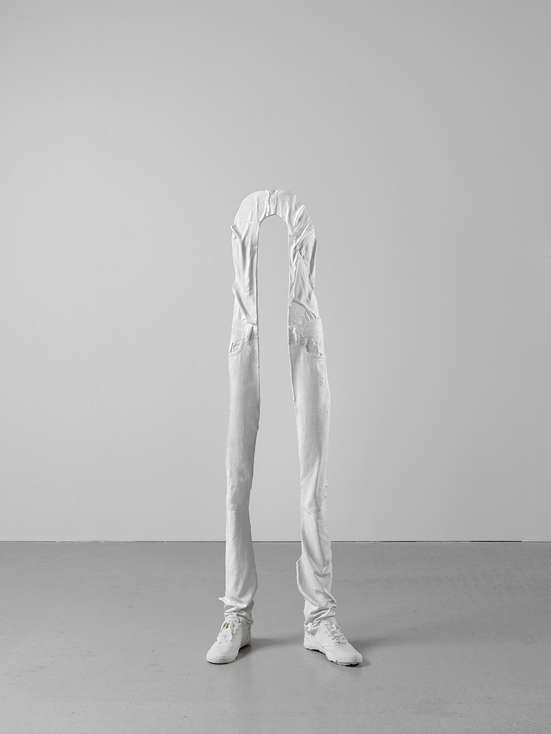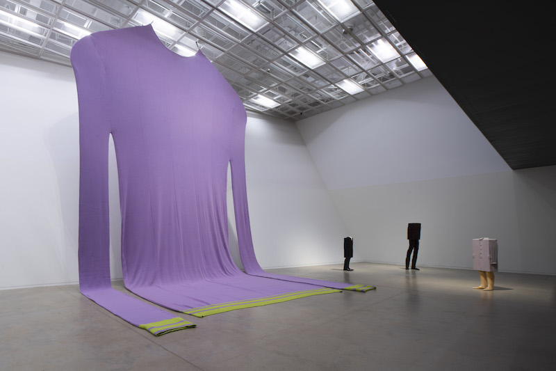 欧文·沃姆认为,尽管我们“由精神、心灵和心理组成,但我们首先是身体……身体是我们与世界其他部分联系的第一衡量标准”。而服装作为人的第二层皮肤、保护壳、轮廓与体积的外化,充当着身体边界及外部世界交汇点的角色。他的创作时常以服饰作为题材展开探索,其创作于2023年的青铜雕塑《罗丹的大衣》来自沃姆的“神经症”系列,作品援引雕塑家奥古斯特·罗丹的巴尔扎克长袍习作,呈现为一个仅由外壳和披风组成的幽灵形象。而边上是长达十一米、宽余七米的《LentCloth》,相较于质地坚硬的青铜,这件“毛衣”则柔软无比。