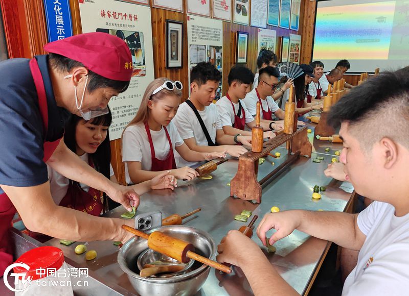 中国台湾网6月19日讯6月15日,来自台湾南投的24位青年代表跨越海峡来到浙江省宁波市奉化区参访交流,参观了溪口镇蒋氏故居,还走进了溪口镇台侨联理事蒋夏怡的蒋家龙门千层饼非遗工坊。在这里,他们不仅品尝了地道的千层饼,还亲身体验了省级非遗项目溪口千层饼的制作技艺,感受了传统手工艺的魅力和深厚的文化底蕴。