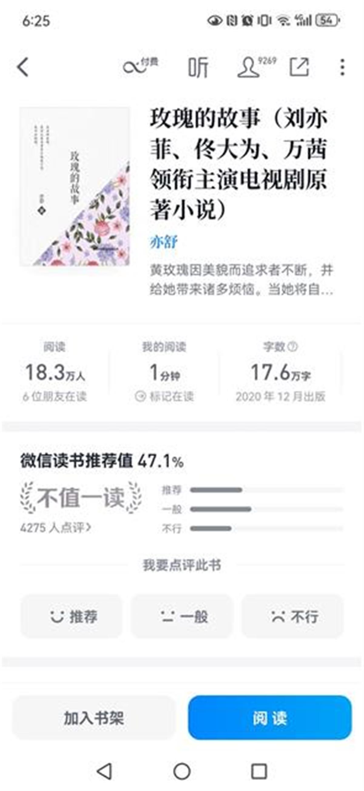 电视剧《玫瑰的故事》热播,不少观众也找来《玫瑰的故事》原著小说来读,不少读者表示看后失望。极目新闻记者在微信读书上看到,对于小说《玫瑰的故事》共4268人点评,推荐者1439人,评为“一般”的1692人,评为“不行”的1137人,总体推荐值只有47.1%。