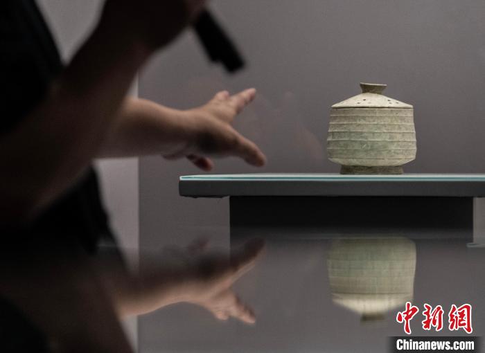 图为国家三级文物、本次展览最古老的薰炉、新石器时代良渚文化“灰陶竹节纹薰炉”展品。