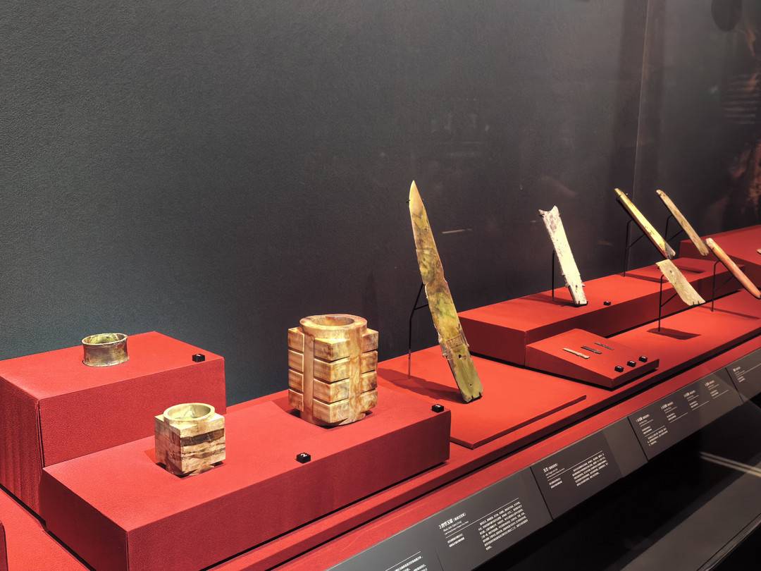 此外,金沙玉器也是此次展品中的重要组成部分。金沙遗址出土玉器3000余件,是国内出土夏商时期玉器数量最多、种类最丰富的遗址之一。此次展览中,正反面呈现不同颜色的双色有领玉璧、集古蜀制玉技术之大成的四节玉琮、“身份成谜”的玉神人面像,还有器形源自黄河流域并经古蜀人融合创新的小玉璋等金沙玉器同台展出,让观众在惊叹于古蜀神秘的文化面貌之余,也能深刻感受到其包容开放又不乏创新创造的文化特质。