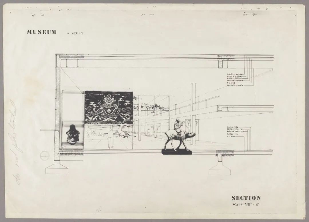 贝聿铭哈佛大学设计学院建筑硕士论文中“上海中华艺术博物馆”设计的剖面绘图1946年由哈佛大学设计学院提供