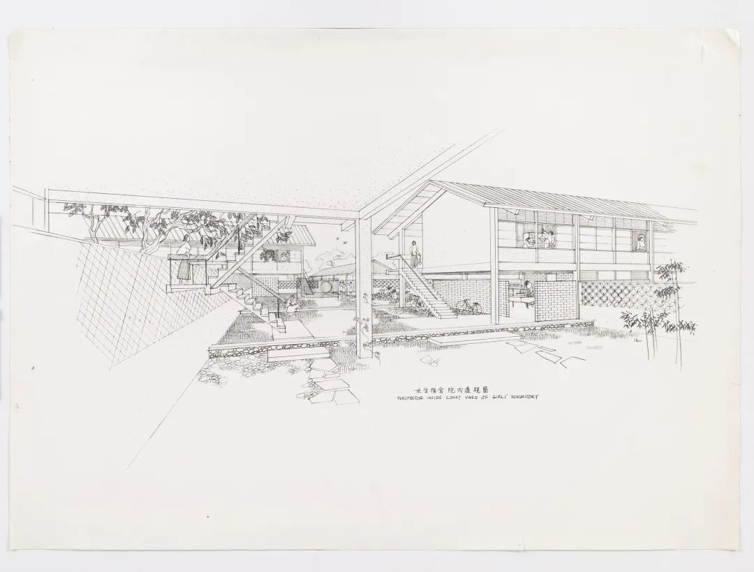 陈其宽(绘图师),贝聿铭建筑师,东海大学(1954–1963)女生宿舍庭院内透视景观,台中,约1955年,复印本,图片:M+,香港,获授权数码复制©PeiCobbFreed&Partners