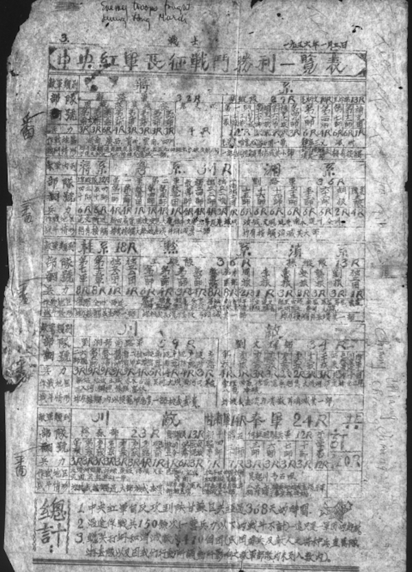 《一览表》上方有斯诺手写英文:EnemytroopsfoughtduringLongMarch(长征中交战的敌军)。《一览表》详细列出敌军类别、部队番号、兵力、作战地区和战斗情形。兵力以大写英文字母R表示regiment,即“团”,交战的敌军共达400余个团。《一览表》是根据敌军类别排列的:蒋系(蒋介石的中央军)包括薛路军(薛岳部)32个团、胡(宗南)纵队27个团、毛炳文部10个团、王均部13个团、上官(云相)纵队12个团;粤系是“南天王”陈济棠麾下的广东军队34个团;湘系主力是湖南军阀何键掌控的刘(建绪)路军32个团;桂系是“小诸葛”白崇禧指挥的广西军队18个团;黔系是王(家烈)纵队名下的贵州军队36个团;滇系是“云南王”龙云掌控的孙(渡)纵队13个团;川敌包括刘湘部南路军59个团、刘文辉部34个团、杨森部23个团和邓锡侯部13个团;甘肃军是新编第14师和第35师的14个团;奉军是何柱国骑兵军和于学忠部的24个团东北军。