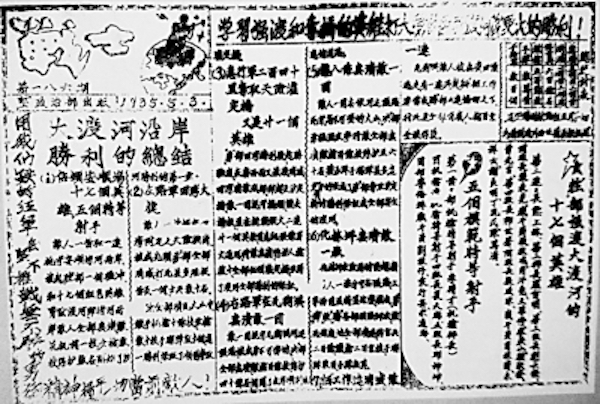 《中央红军长征胜利一览表》只见于燕京斯诺特藏1936年1月3日油印出版的《战士》报第3版。《战士》报历史悠久,1930年由红一军团政治部在江西中央苏区创刊,8开2版油印。1934年10月红军长征开始,红一军团政治部改用“坚政治部”名义,继续出版该报。目前发现的1935年5月26日的第184期和5月3日(可能应为6月3日)的第186期(图5),保存在中国人民革命军事博物馆。第186期因报道了强渡大渡河、飞夺泸定桥的红军重要战斗的事迹而引人注目,被列为国家一级文物。