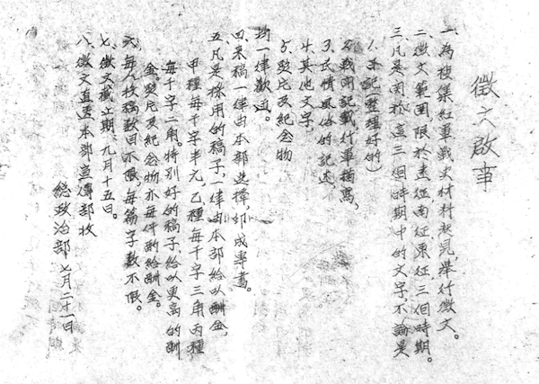 哈佛燕京图书馆的斯诺特藏(EdgarSnowCollection)保存了一份总政治部1936年7月21日发的《征文启事》。(图1)