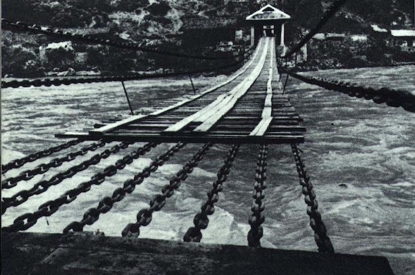 红军5月9日围攻了川西会理的刘文辉部第1旅,于16日撤围北上;17日逐走刘文辉部第16旅,进占德昌,随即绕过西昌;5月22日攻占越西(越嶲)和冕宁后北上。红1军团第1师第1团控制安顺场渡口,5月25日强渡大渡河,红1军团第1师从安顺场过河,为右路,中央红军主力为左路,夹河而上。右路抵达泸定县城南面的龙八步、冷碛,与刘文辉部第4旅激战;左路5月29日击败刘文辉部第4旅一部,飞夺泸定桥,(图10)占领了泸定县城,中央红军主力全部东渡大渡河,打破了蒋介石要红军做“石达开第二”的计划。中央红军5月31日到6月1日,又击溃泸定县化林坪刘文辉部第4旅一部,俘敌约600人。