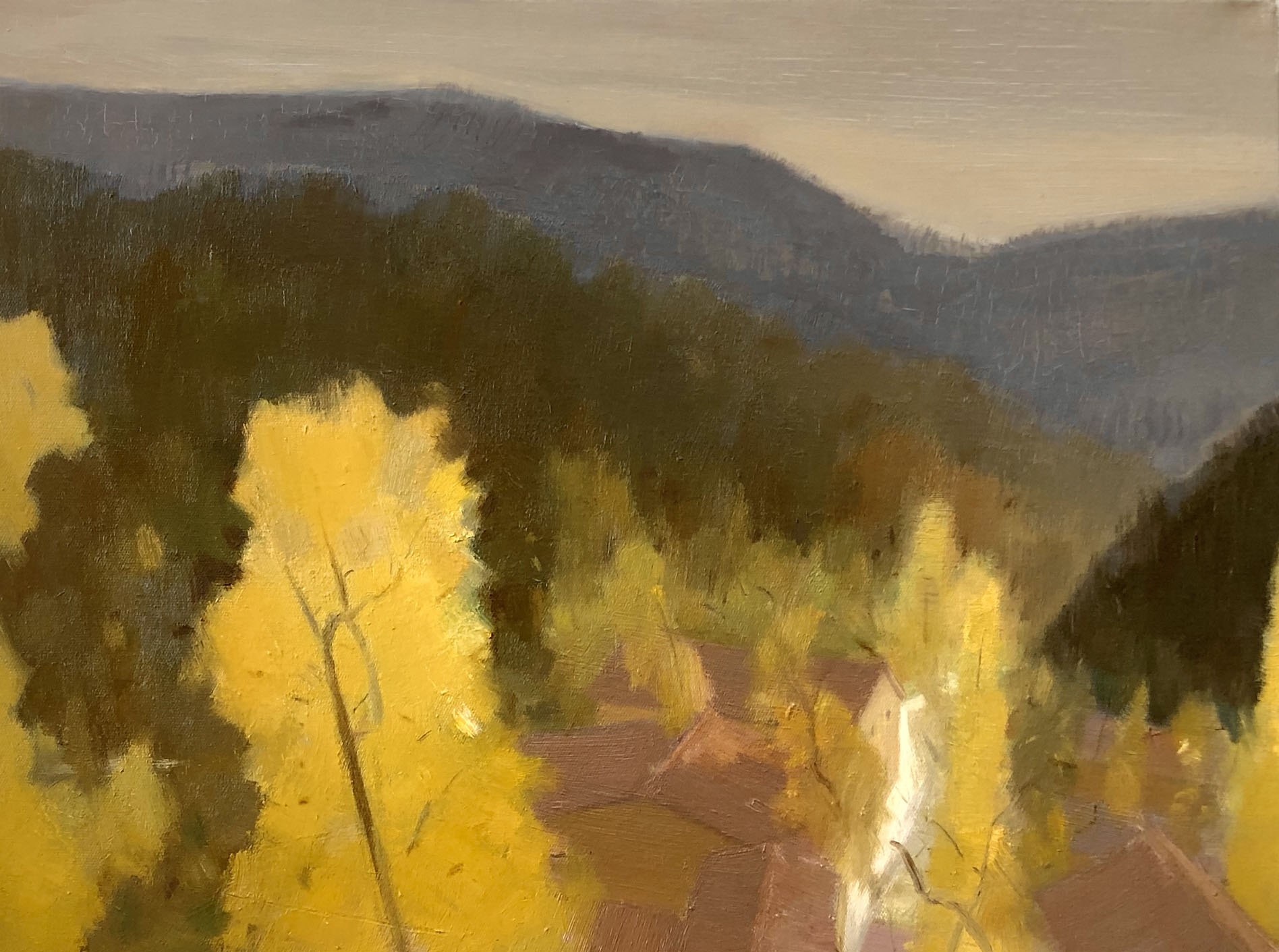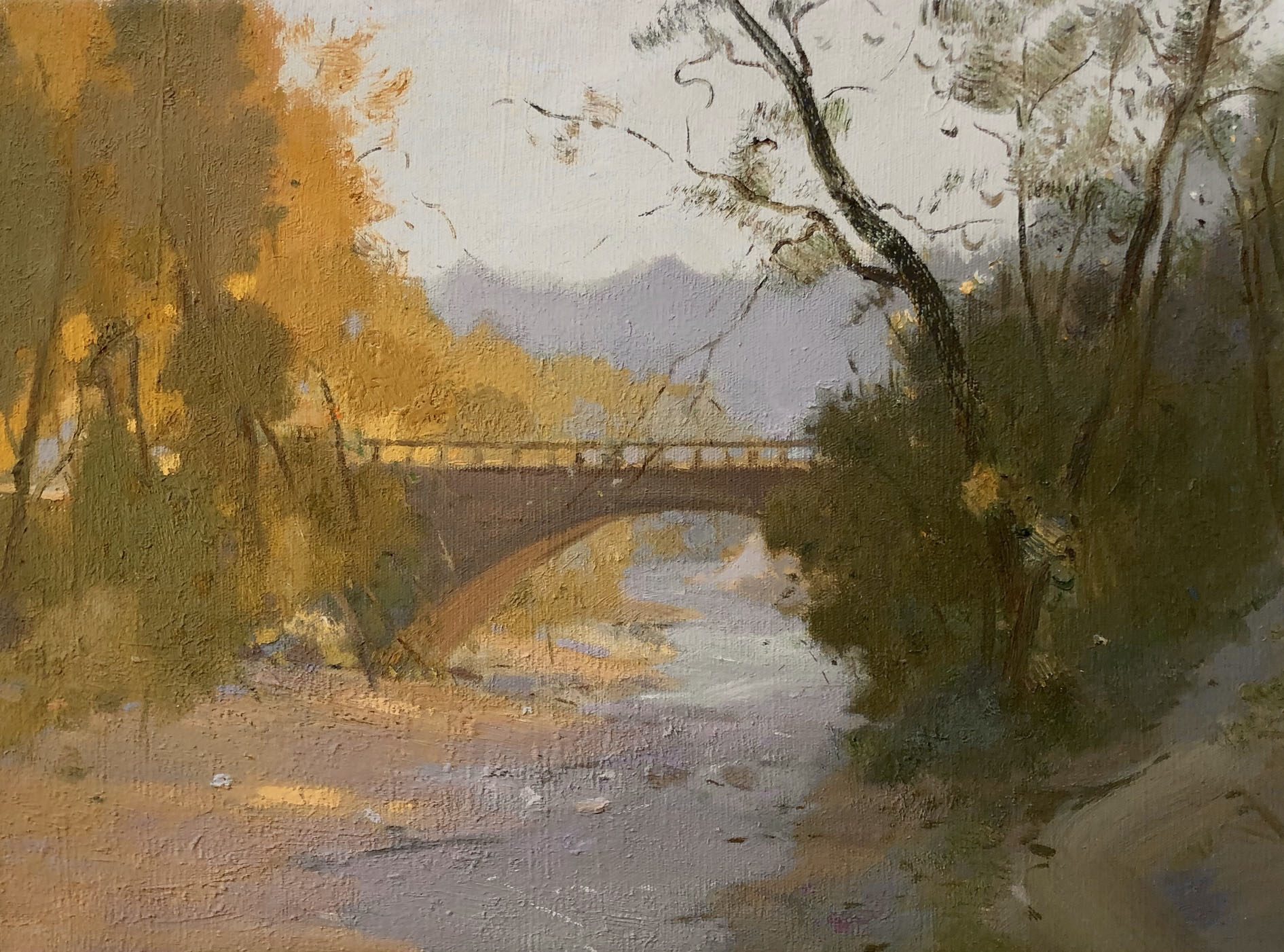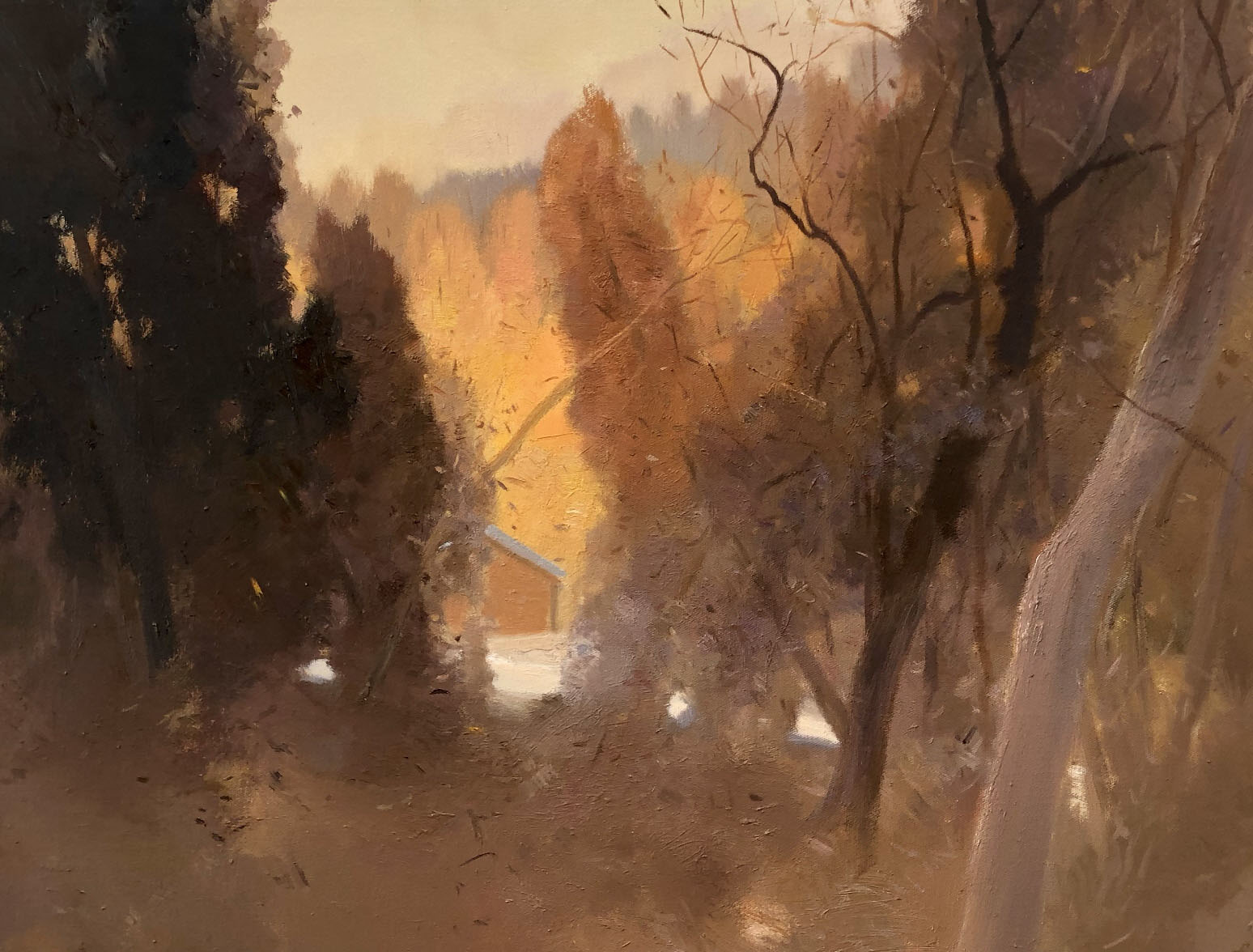 细心观察曹生龙的风景创作可以感觉到,在色彩应用方面,他营造出了非常有吸引力的意绪氛围。他喜欢在整幅画面中铺陈大面积的色彩主基调,这个基调往往让我们想起了我们每一个人曾经亲身经历过的投身大自然的过程之中,那些由感动产生的瞬间体悟。当我们面对大自然时,我们往往会或情绪亢奋,或情结舒缓,进入一种疗愈心性的状态,从绚烂美丽的自然景观之中,感悟造物的神奇与内心深处的诗意,体会人生与造物的哲理。这是能够欣赏大自然的人才可以获得的一种诗情画意。如果仔细观察他的用色及其所实现的效果,这一点就会非常突出了。在他的作品中,或者是漫山黄叶尽染的秋原,或者是晨曦时分的灿烂,或者是凉风送爽的浪漫之蓝,或者是某个角落里一抹阳光照射之下凸显的青石凝冷和婆娑叶明,这些自然景色所特有的生鲜活泼,通过曹生龙的彩笔,正在进行着一个主观化的意象性的过程处理,整个画面充满着一种诗性画意的美学趣味。这种诗意的表达,如果我们仔细琢磨的话,就会感到和他在色彩使用上的一种意绪化的理解是直接联系在一起的,我认为这是他常年进行色彩实践所形成的一种高级的技巧了。做个比喻的话,就好像他在观察大地景观之时,使用了摄影滤镜,我们所看到的寻常景色,经过他那滤镜般的色彩提炼,更加充沛着诗意的氛围。在他的笔下,晨曦更加地浓郁,秋景更加地娇艳,树阴遮蔽的凉爽之地,充满葱绿的浪漫或者蓝色的浪漫。我不禁想起了西方近现代油画史上非常微妙高级的克莱因蓝,这是只有那种油画色彩的高级处理才应该有的丰富与玄妙的魅惑力。这种魅惑力通过曹生龙的处理成了极具个性化的一种审美表达。