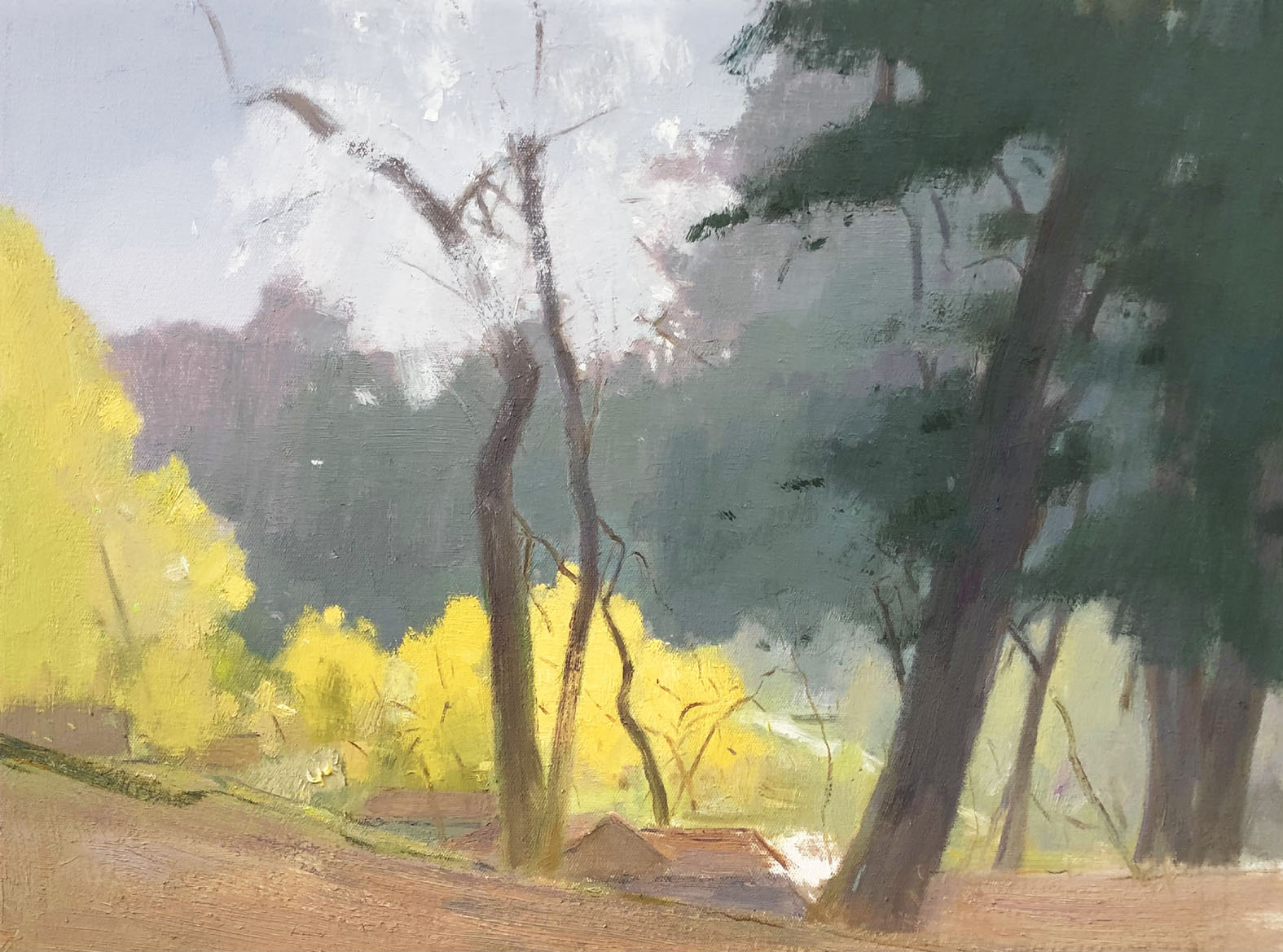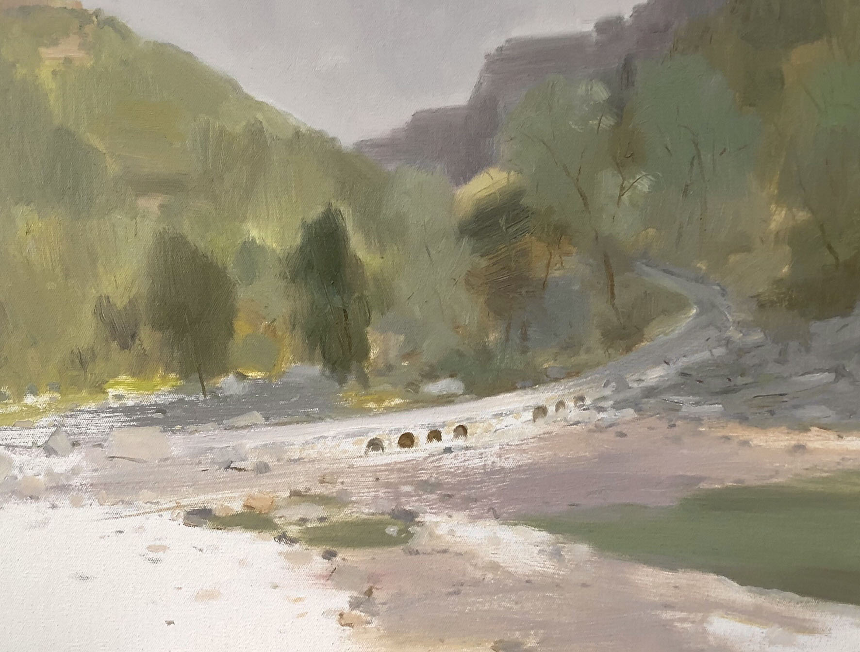 曹生龙的油画让我们感受到的这种诗意,不仅依靠他那滤镜般的色彩营造,还有他利用油画颜料特有的厚重度和直接画法所特有的一种堆积优势,在他的画面中所进行的一些局部的肌理表达上的微妙感觉。在他的作品中,你可以看到,或者是浓彩厚涂,或者是堆积摩擦,或者是颗粒点缀,或者是丝绒细铺,这些依据景观质地所进行的相应的局部的肌理处理,和整体的氛围营造,诗意传达,显得那么地和谐,有着令我们无法舍弃的诱惑,添加出在朦胧诗意表达中的绘画性语言的特有的氛围感。