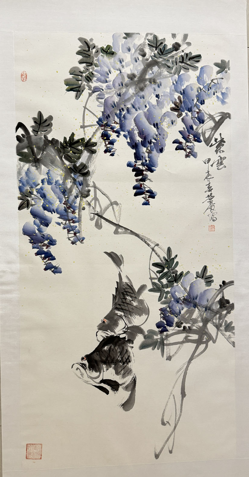 荣庆的《紫云》,画面表现的是紫藤花下有两条鱼在追逐。笔墨活泼老练,两条鱼的动感较强,一前一后很明了,前鱼的透视关系很独特,后鱼的尾巴翘得高高,这给画面增添了许多趣味。S型构图是传统特色,有改进余地的是紫藤花和藤的画法,多观察写生和实践。如果题上几句就更有文人画特色了。