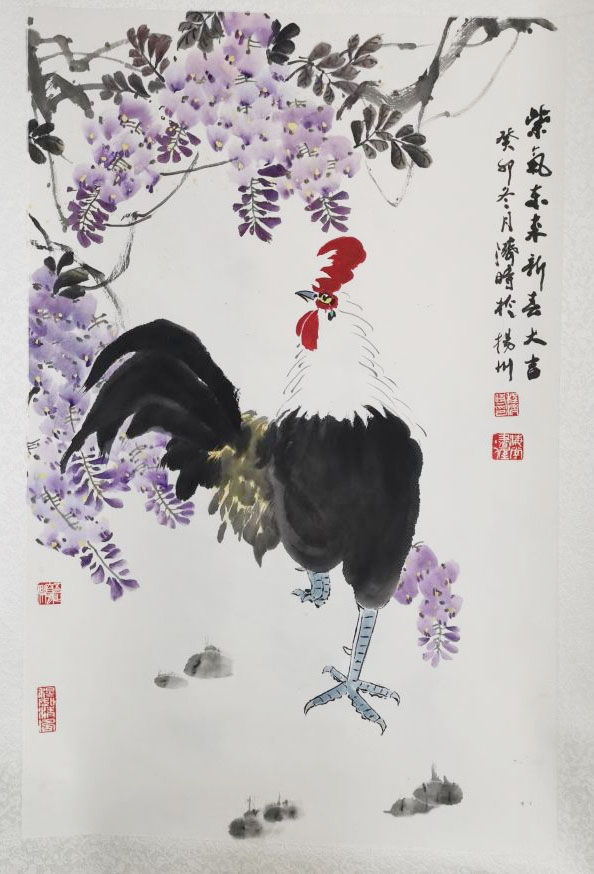 程济时的《紫气东来》,表现的是一只大公鸡和紫藤花。大公鸡画得昂首挺胸,气宇轩昂,背景是紫藤花,用笔用墨比较熟练。不过,大公鸡的神态虽好,但在结构造型上还有所欠缺,建议加强观察写生,不断提高进步。