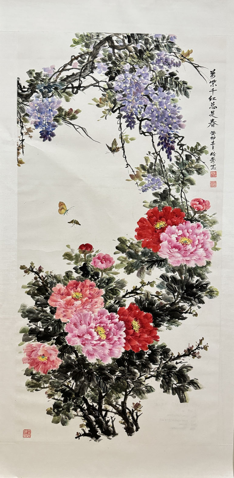 李树蓉的《万紫千红总是春》,表现的是牡丹花和紫藤花盛开的景象。牡丹花团锦簇,花形和层次都很饱满,色彩鲜艳,气象繁荣。上方的紫藤花也很夺目,三只蝴蝶画得也是认真到位。总体感觉画面很紧,不轻松,例如,叶子可以画得少一点松动一点,紫藤的枝干可以画得舒朗放开一点,作者可以做一些大胆尝试,不断进步。