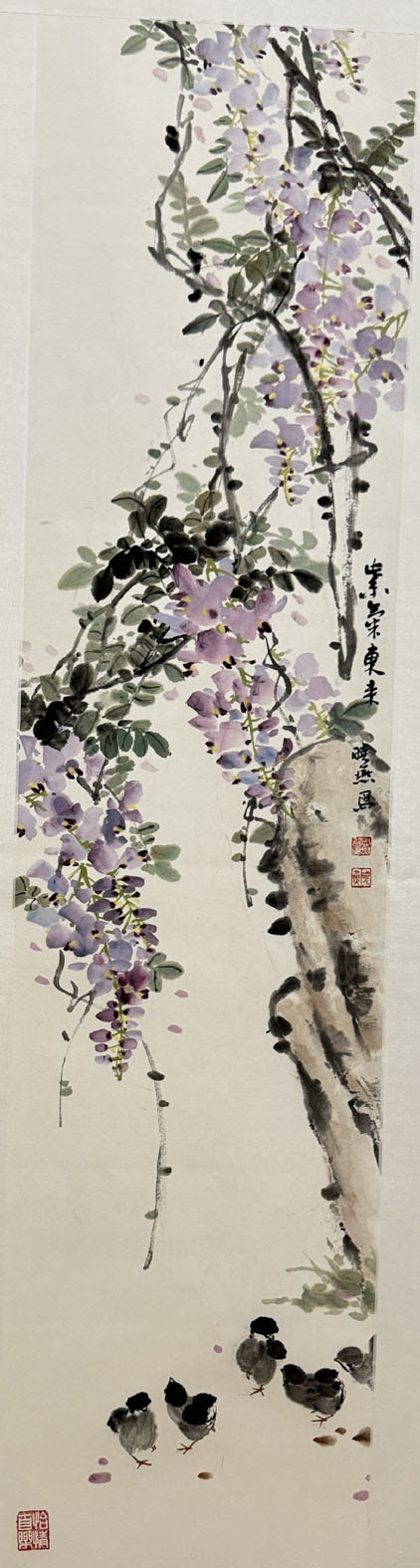 习晓燕的《紫气东来》,主要表现了紫藤花、石头和小鸡,这是一个传统的题材。作者也是传统的画法,画面不乱,笔墨表现有章法,下面几只水墨小鸡给画面增添了情趣。如对小鸡再多一些观察与写生,一定还会有提高。