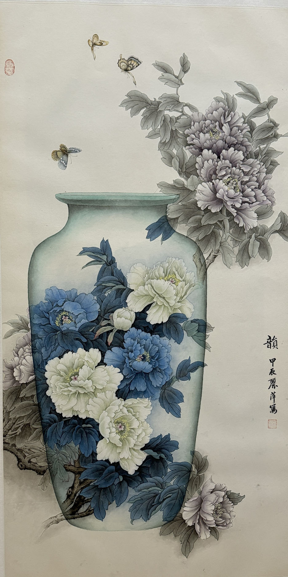 顾丽萍的《韵》是一幅工笔花鸟画,主要表现牡丹花的风韵。作者的造型有基础,线条流畅,设色冷淡,在花和瓶的关系上有构思。三只蝴蝶画得很认真到位。如果在色彩以及安排上再响亮一些就更好了。