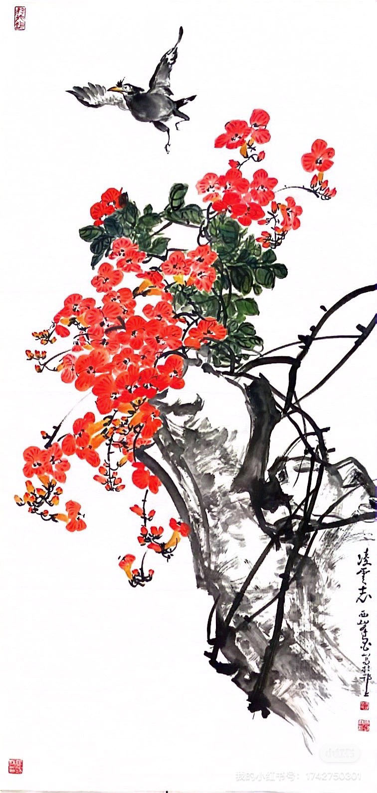 张锦妹的《凌云志》,取材正是当下时节盛开的凌霄花,凌霄花也是中国画家喜欢的传统花鸟题材。作者笔下的凌霄花开正盛,红花、绿叶、墨藤、飞鸟组成的画面中洋溢着一种积极昂扬的气息,不仅与花的寓意合,同时作者作为一名教书育人的教师,也是有通过画面表达了对学生的期冀和祝福之意。当然,从中国画的技法层面来看,作者还有需要进一步提升的空间。