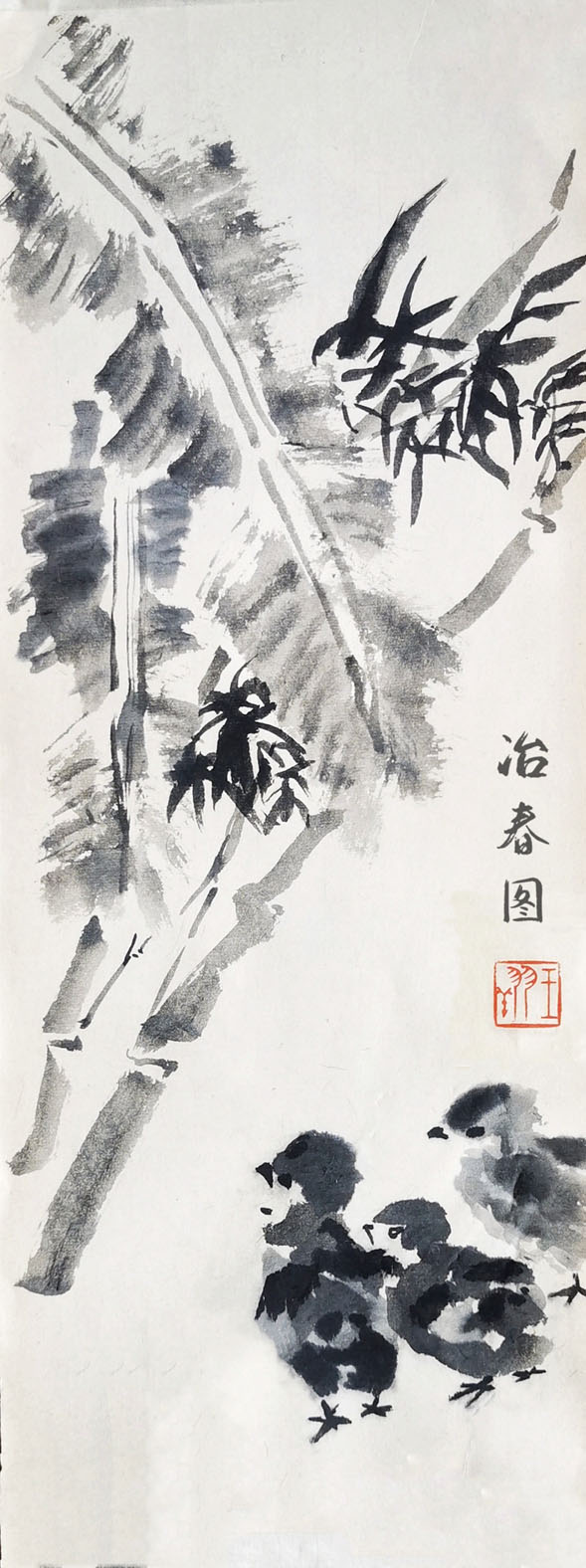 王翔的《冶春图》,画面上描绘了三只小鸡和竹子芭蕉,是一幅小品水墨画。三只小鸡好像刚刚来到这个世界,一切都很新鲜。作者用水墨表现竹子和芭蕉,笔法老练,有文人画的气质。建议多加强笔墨的表现力,多学习研究一些传统的文学艺术作品,加强书法练习,全面提高艺术素养,画好新时代的文人画。