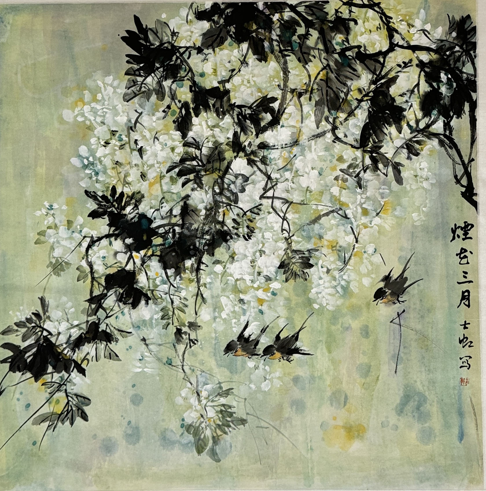 郭士虹的《烟花三月》,表现了三只燕子在白色的藤花架下飞翔嬉戏的场景。笔墨酣畅老练,造型生动有动感。如果画面的背景画法用笔再有序一点,定会给作品增添更好的层次境界。