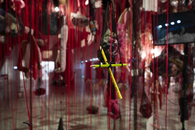 上海当代艺术博物馆一层序厅,被一件红色大型装置占据,也吸引着所有人伫足。这件名为《依赖/独立》(1995-1996),以绳索和网丝悬挂着填充玩偶、塑料、铅笔、黑白照片以及种种日常物品,以宏大的尺度牵连起记忆与想象,表达了艺术家对世界不同生物关系的思考及其生死观。