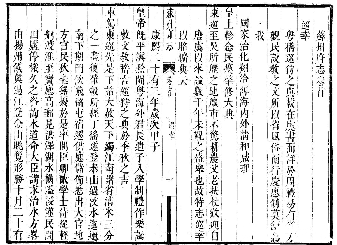 康熙《苏州府志》刻于康熙三十年(1691),距康熙帝第一次“南巡”苏州已经7年。康熙《苏州府志》是清代苏州第一部官修府志,进士沈世奕、状元缪彤等参与编纂。康熙帝六次“南巡”苏州,第二次为康熙二十八年(1689),也被记入了康熙《苏州府志》。康熙《苏州府志》首卷开创性定为《巡幸》,记述皇帝巡视苏州情形,奠定了清代苏州府志的基本体例。
