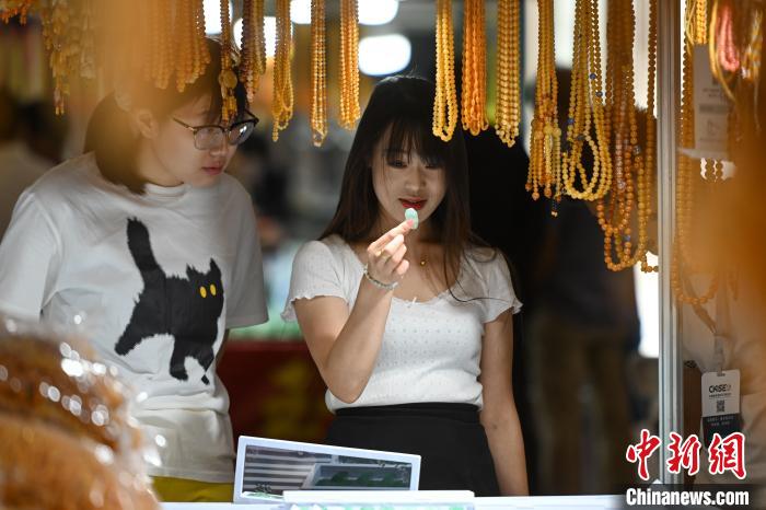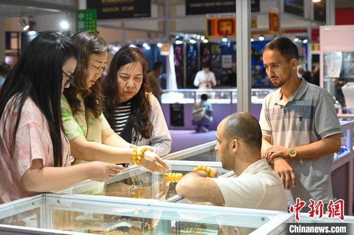 7月11日,参观者挑选来自阿富汗的蜜蜡手串。当日,2024中国昆明国际石博览会暨云南国际珠宝玉石展开幕,本届石博会围绕“珠宝玉石、赏石文化、非遗工艺”三大核心板块,设置国际品牌珠宝馆、时尚首饰馆、玉石翡翠馆、奇石馆、工艺美术馆。 中新社记者李嘉娴摄
