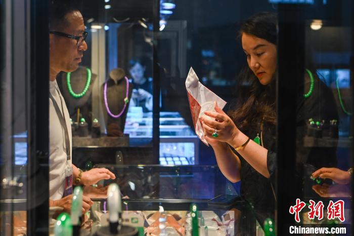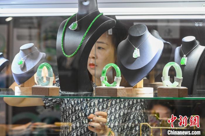 7月11日,参观者试戴翡翠饰品。当日,2024中国昆明国际石博览会暨云南国际珠宝玉石展开幕,本届石博会围绕“珠宝玉石、赏石文化、非遗工艺”三大核心板块,设置国际品牌珠宝馆、时尚首饰馆、玉石翡翠馆、奇石馆、工艺美术馆。 中新社记者李嘉娴摄