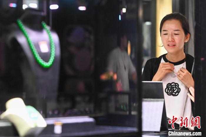 7月11日,参观者挑选玉石饰品。当日,2024中国昆明国际石博览会暨云南国际珠宝玉石展开幕,本届石博会围绕“珠宝玉石、赏石文化、非遗工艺”三大核心板块,设置国际品牌珠宝馆、时尚首饰馆、玉石翡翠馆、奇石馆、工艺美术馆。 中新社记者李嘉娴摄